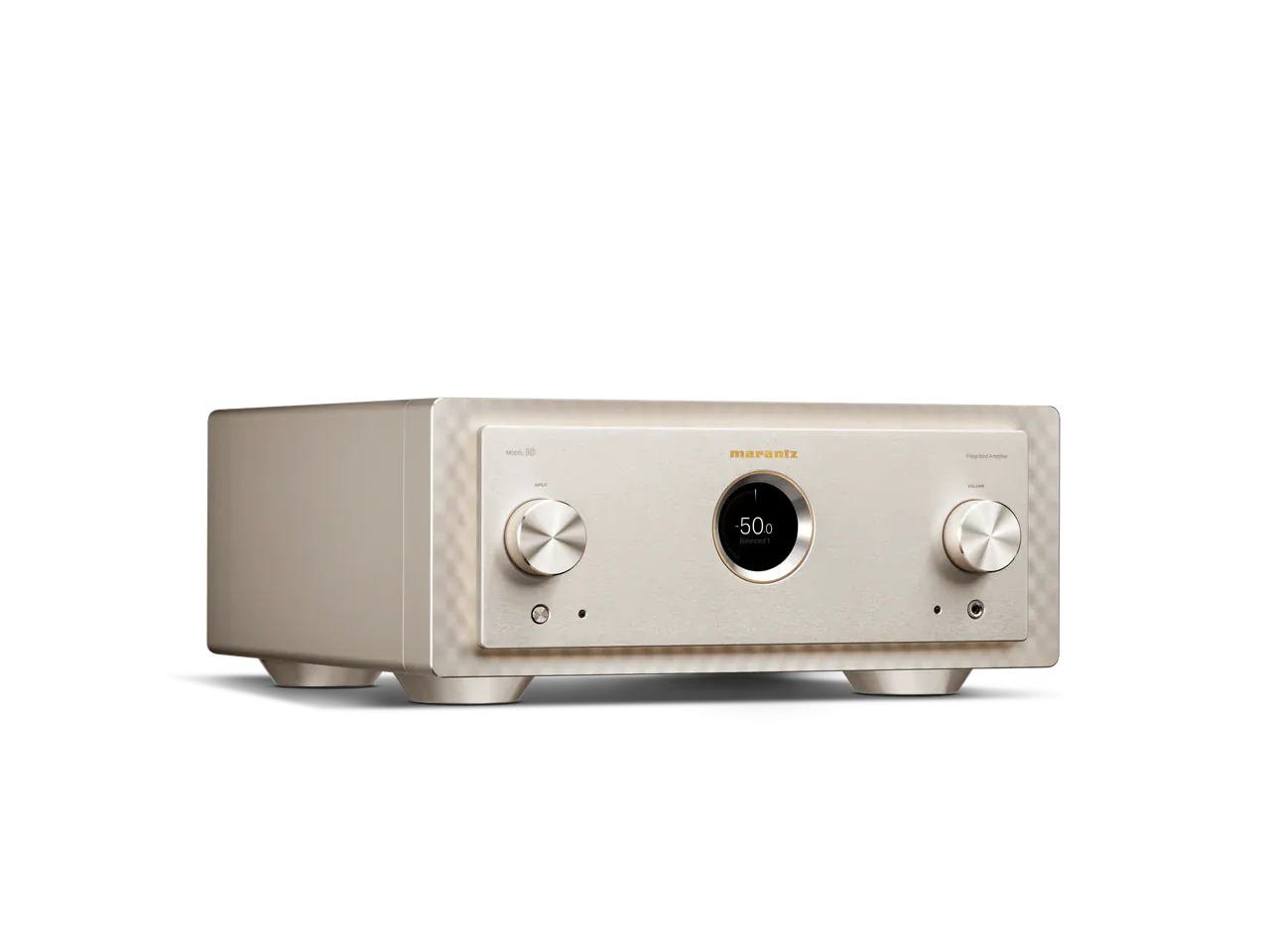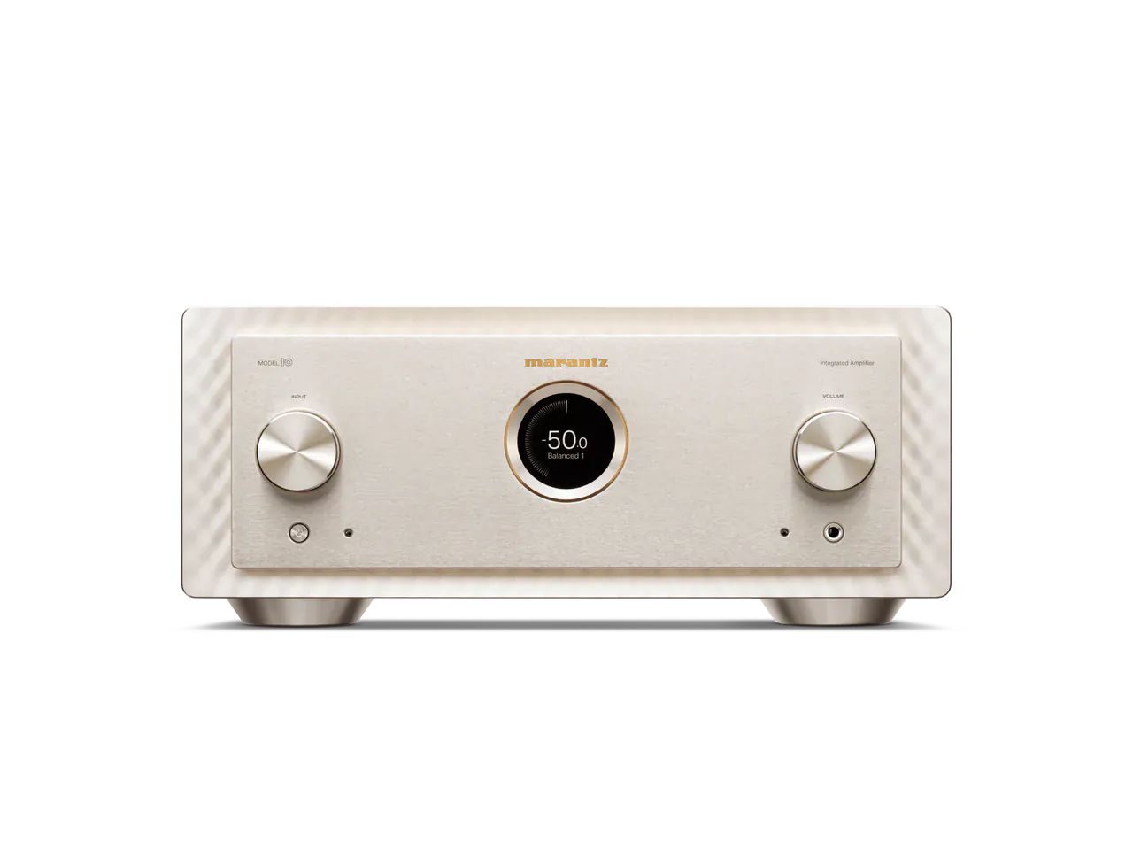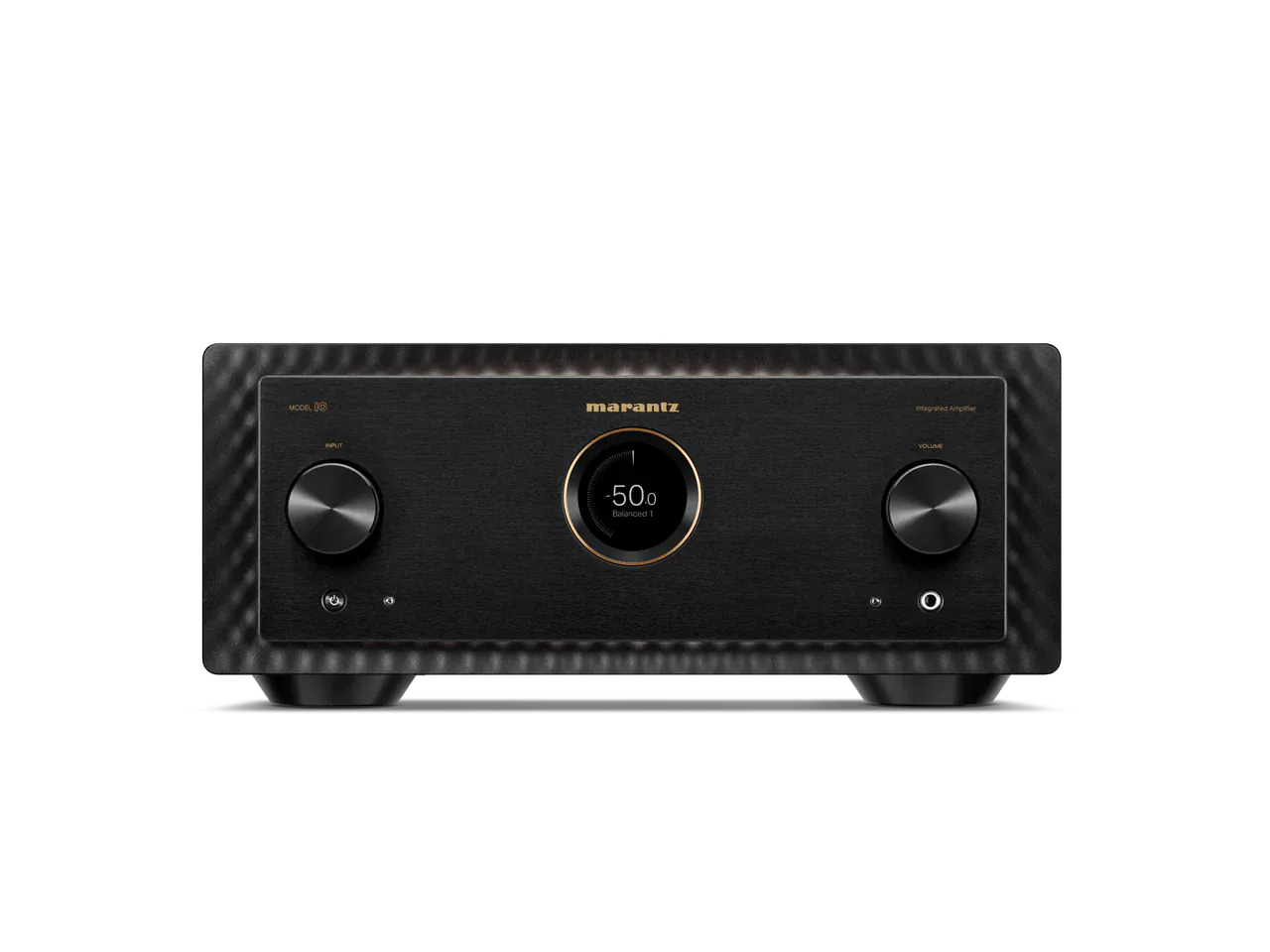 Designed with a brushed aluminum front, MODEL 10 is encased in a copper-plated, triple-layered chassis with illuminated mesh cover grille. Lighting inside the amplifier showcases the circuit boards, high-quality components, and specially designed transformer case. In a nod to the Marantz design DNA, MODEL10’s porthole houses a HD TFT Colour Display for volume and input selection, along with a digital level meter that behaves like vintage analog meters.